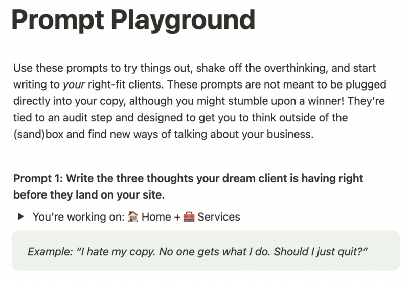 A Notion-based copy audit built on the exact framework I use in 1:1 copy audits. with prompts, tips, and checklists for your entire site.